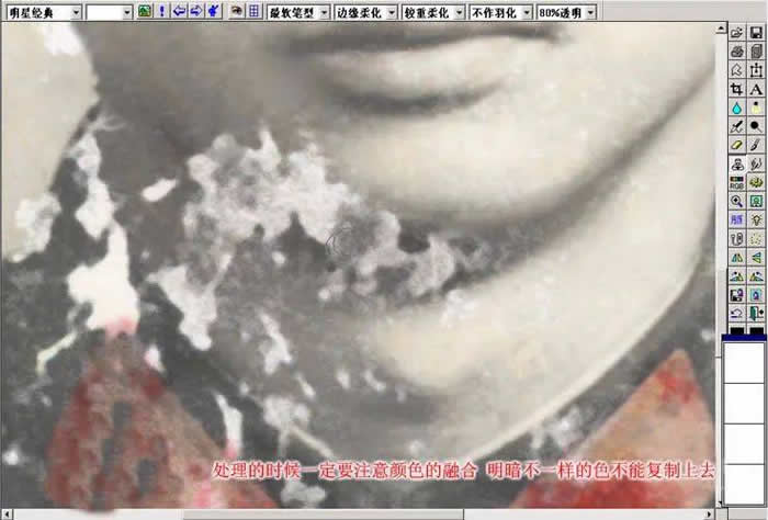 12.此图片最难处理的部分下巴,先将小的脏点漫漫处理掉再去处理比较大的脏块